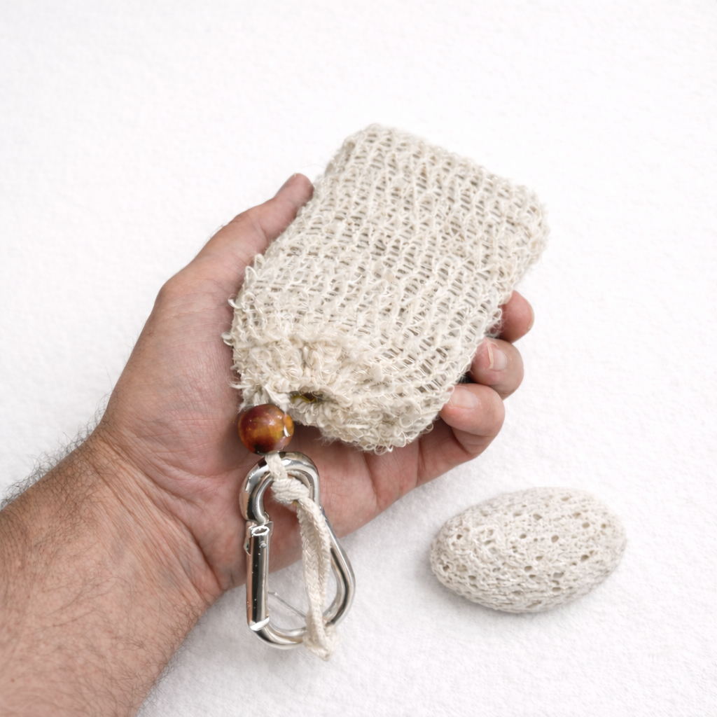 Each block comes in a natural sisal soap pouch with a carabiner clip, ready to clip onto a ute, garden tap, or even the shower caddy.
