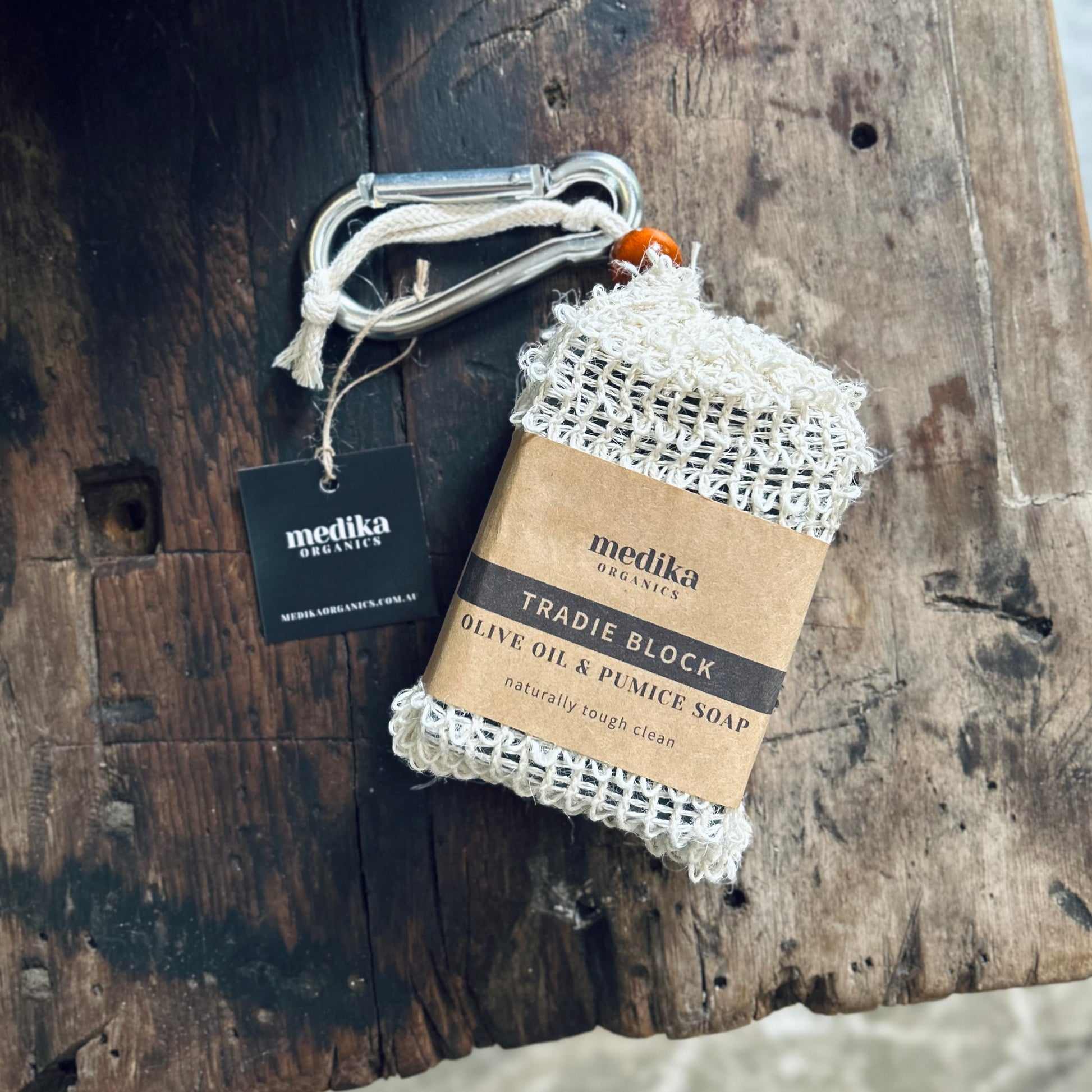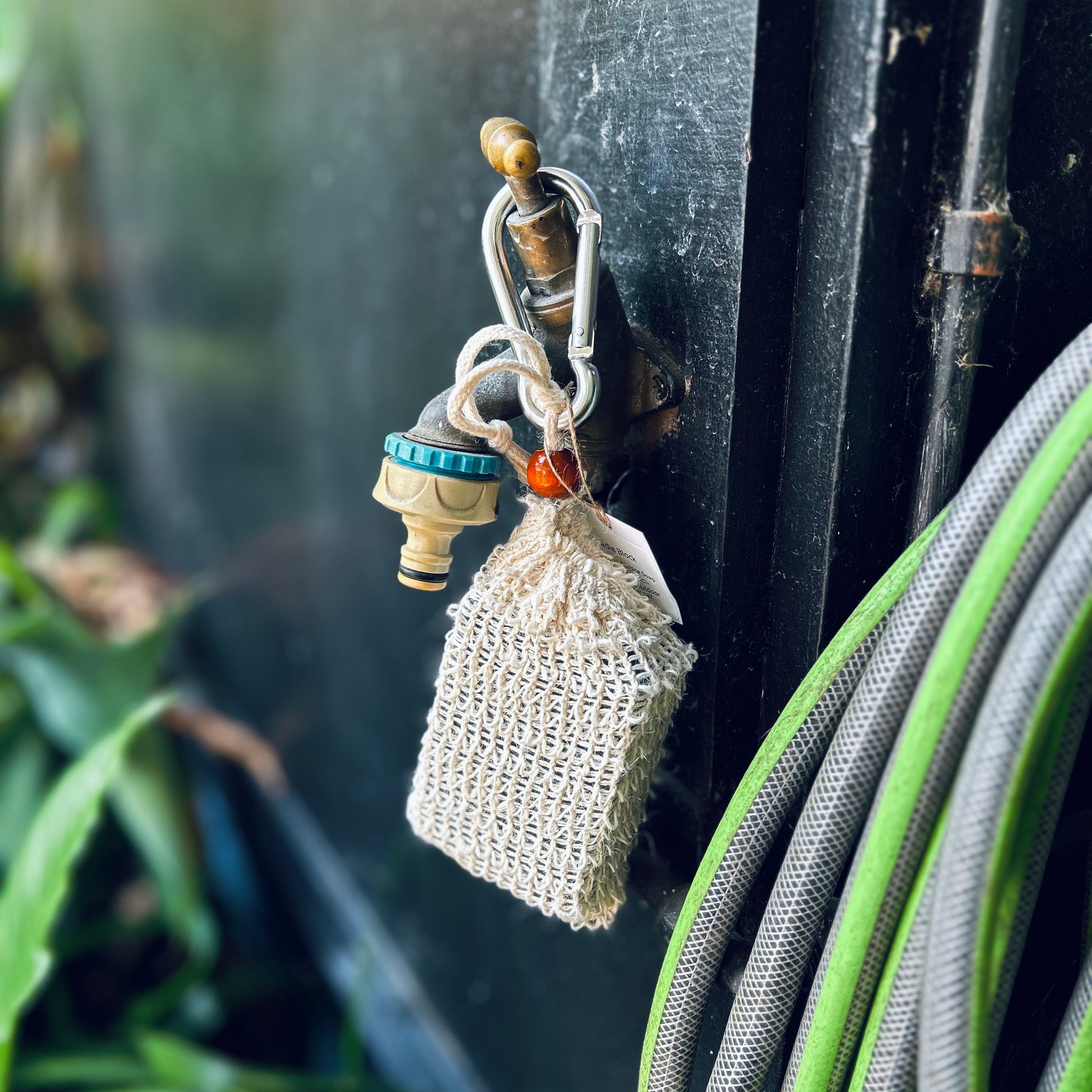 Each block comes in a natural sisal soap pouch with a carabiner clip, ready to clip onto a ute, garden tap, or even the shower caddy. A practical addition to everyday care, made simply and with intention.